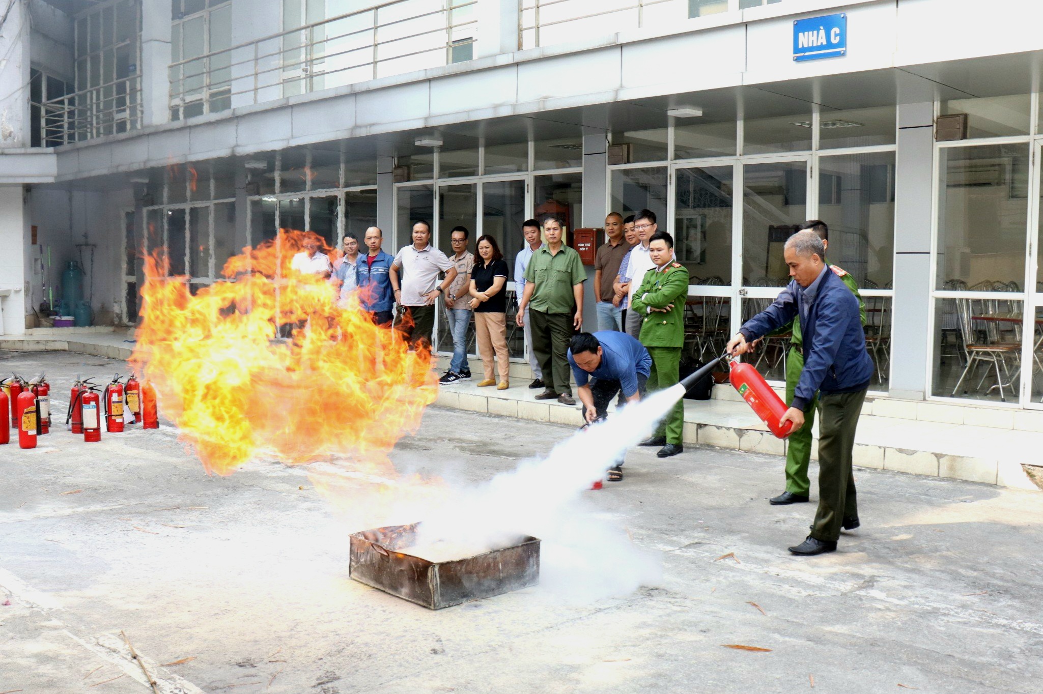 Sau phần lý thuyết, các học viên đội PCCC&CNCH của cơ quan Tổng công ty được thực hành sử dụng phương tiện chữa cháy tại chỗ, thực tập phương án chữa cháy theo các tình huống giả định, thực hành cứu nạn khi xảy ra tình huống cháy tại cơ sở. Ngoài ra học viên còn được hướng dẫn cách kiểm tra và sử dụng các trang thiết bị phương tiện PCCC được trang bị tại cơ sở; phương pháp cấp cứu nạn nhân bị ngừng hô hấp, bị bỏng …; phương pháp di chuyển nạn nhân; phương pháp sử dụng dây trong CNCH; cách dập tắt đám cháy khay xăng, bình gas…